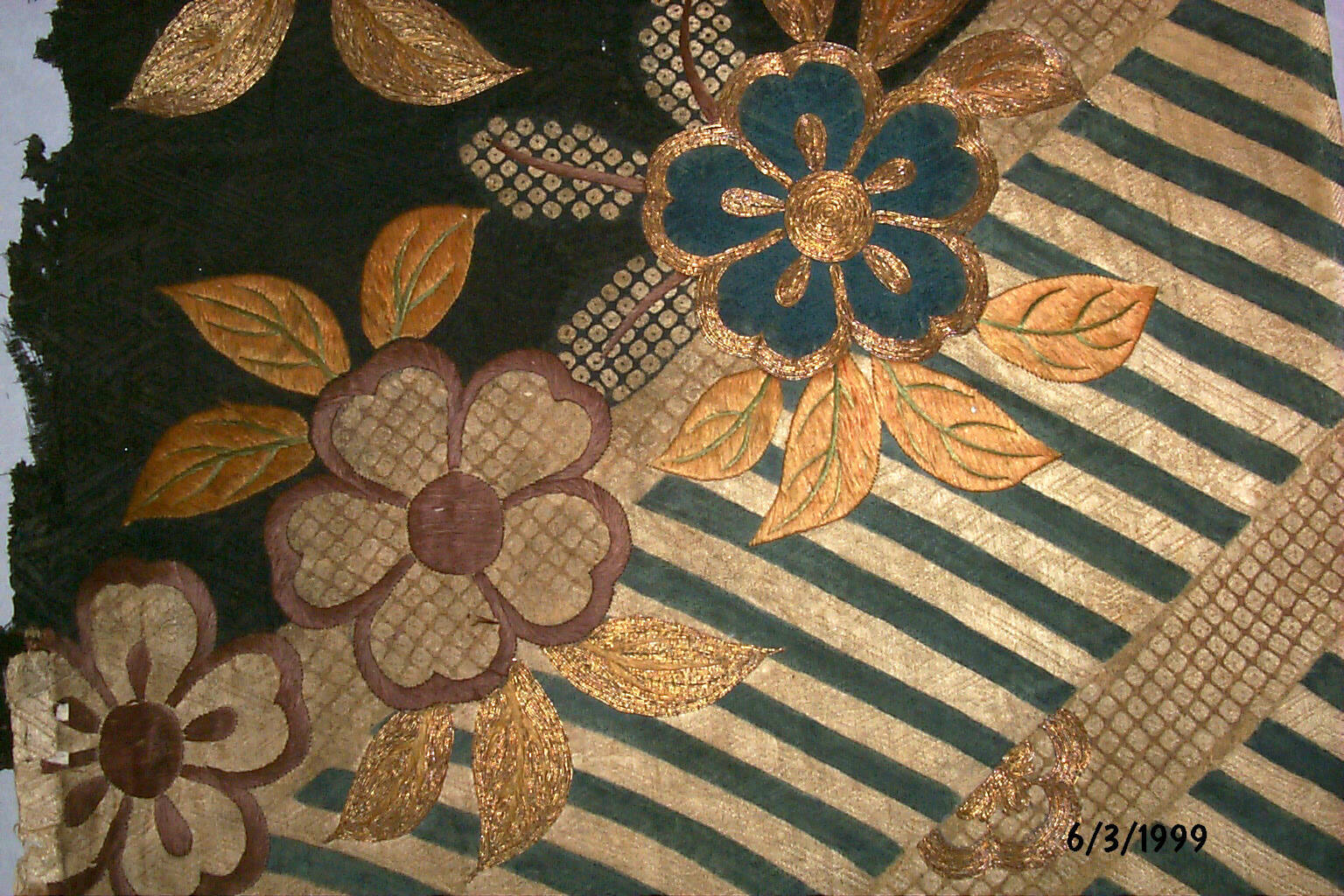 DescriptionBlack dyed and white figured satin ground with stencil tie dyeing, silk and metallic thread embroidery. Bamboo curtain and cherry blossom design. Gold thread embroidery couched with yellow threads.