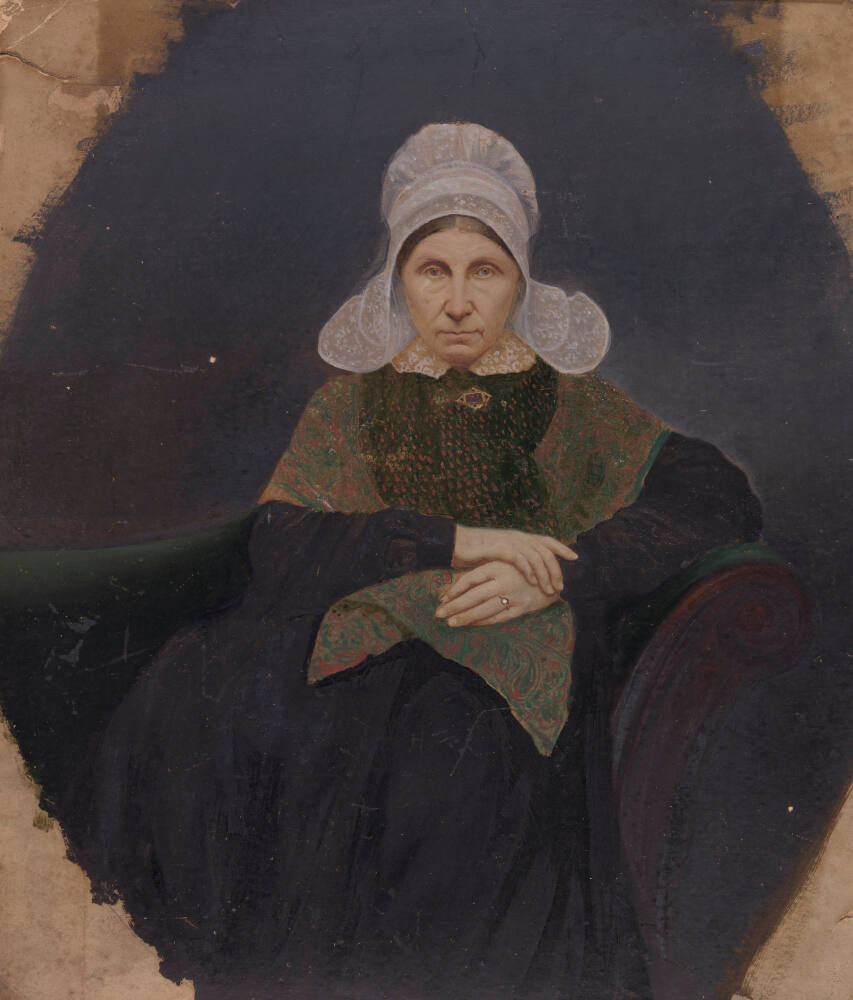 DescriptionHand-colored portrait of a woman seated with arms crossed across lap. She wears a dark black dress with a scarf over her shoulders, a brooch, and a lace bonnet.Exhibition HistoryFrench Primitive Photography, Philadelphia Museum of Art, November 17 - December 28, 1969, cover illustration.
