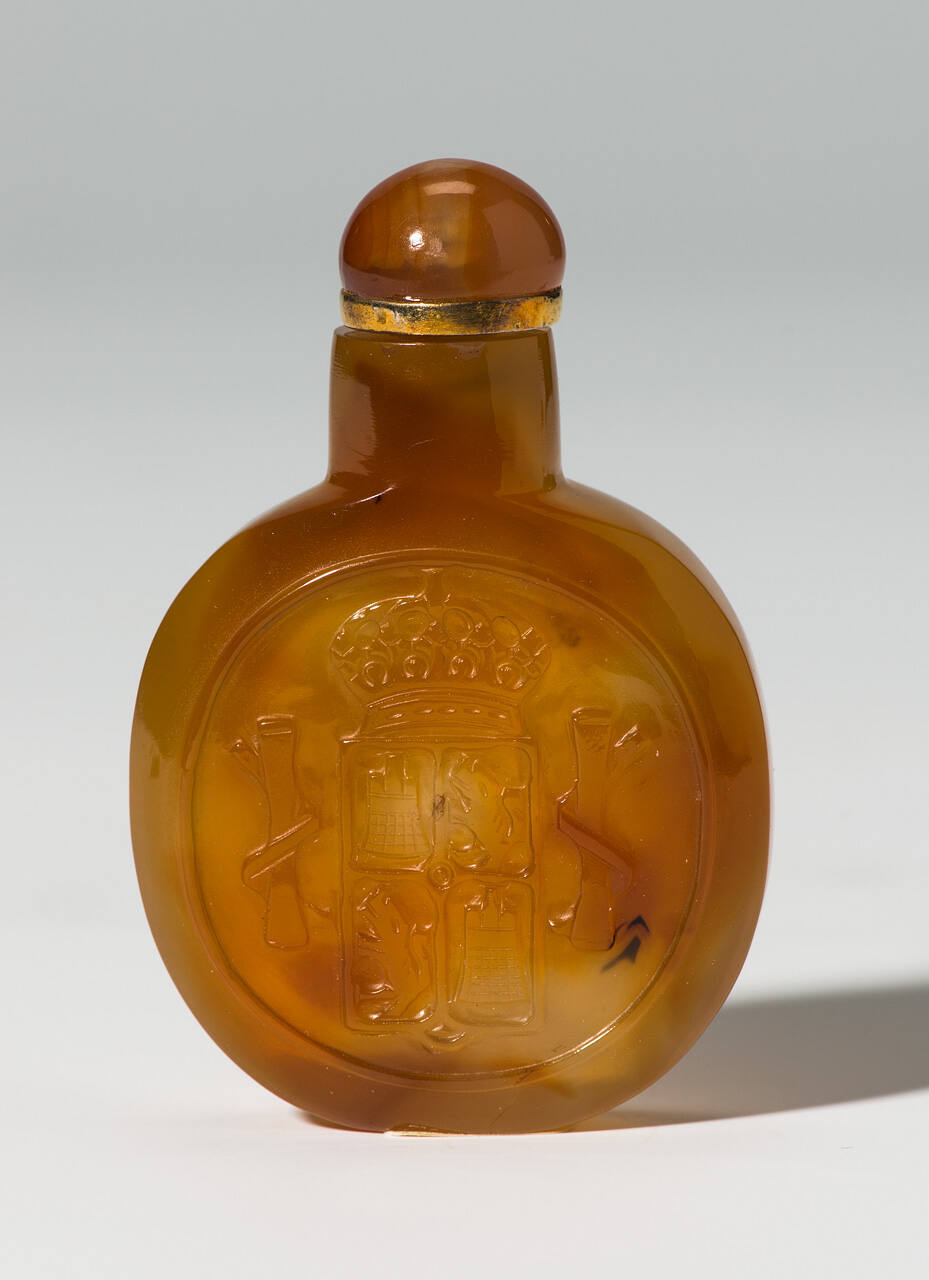 DescriptionMoon-shaped carnelian agate bottle, carved with arms of Spain and on reverse with head of Spanish king taken from a Spanis coin, matching carnelian stopper.
