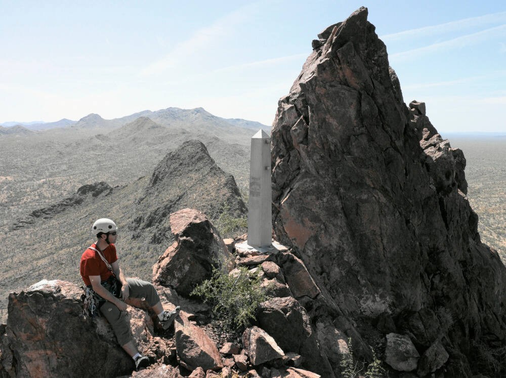 DescriptionOne of 276 views of the United States-Mexico border included in portfolio. Image of man wearing climbing gear seated on large rock next to stone obelisk. [Geographic Description: Southeast view. Sierra la Alesna.]Provenance