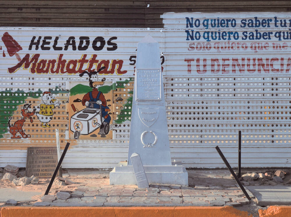 DescriptionOne of 276 views of the United States-Mexico border included in portfolio. Image of monument installed in front of wall with mural depicting cartoon characters and text in Spanish.[Geographic Description: North view. San Luis Rio Colorado, Sonora.]Provenance