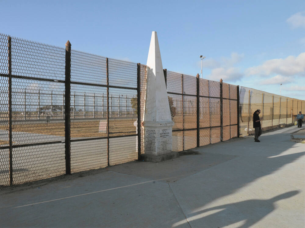 DescriptionOne of 276 views of the United States-Mexico border included in portfolio. Image of monument installed in middle of fence with two men standing nearby on sidewalk. [Geographic Description: Northeast view. Playas de Tijuana.]Provenance