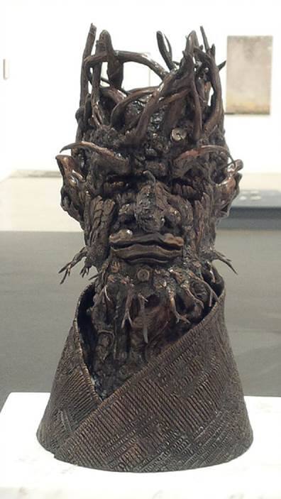 DescriptionThis sculpture depicts the bust of a man-like creature composed of botanical materials. His headdress is made of twisting tree limbs and ivy frames his face, which is composed of a gnarled tree trunk devoid of foliage. The creature’s brow is furrowed, and he is frowning.Copyright© Philip Haas