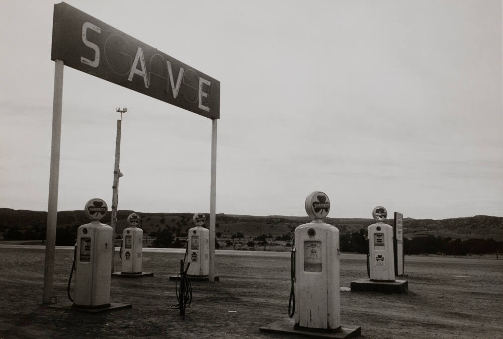 DescriptionImage of unoccupied gas station along highway overlooking landscape with low lying hills. The gas pumps have shamrock logos on top and there is a neon sign which reads "SAVE GAS".Exhibition HistoryRotation 26. The Nelson-Atkins Museum of Art, Kansas City, MO, March 29, 2019- August 25, 2019, no cat.