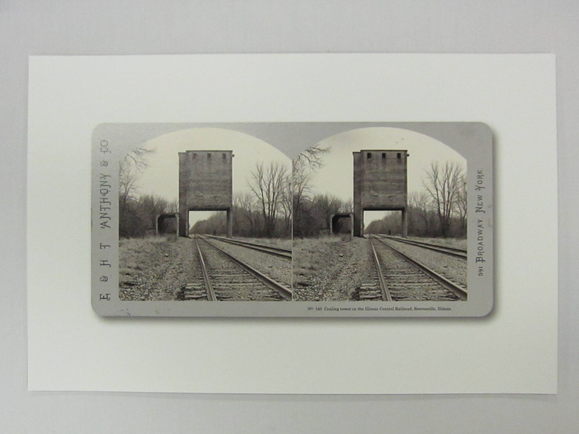 On card recto, bottom, in black type: “No. 140 Coaling tower on the Illinois Central Railroad, Reevesville, Illinois.”;