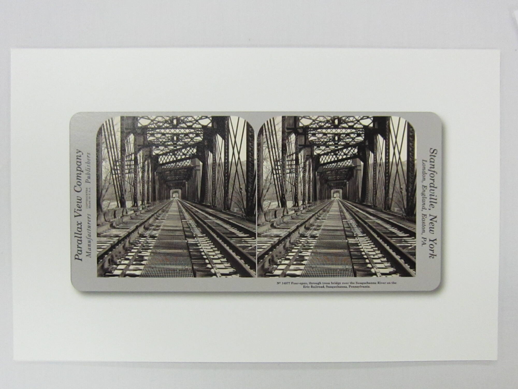 On card recto, bottom, in black type: “No. 14077 Four-span, through truss bridge over the Susquehanna River on the / Erie Railroad, Susquehanna, Pennsylvania.”;