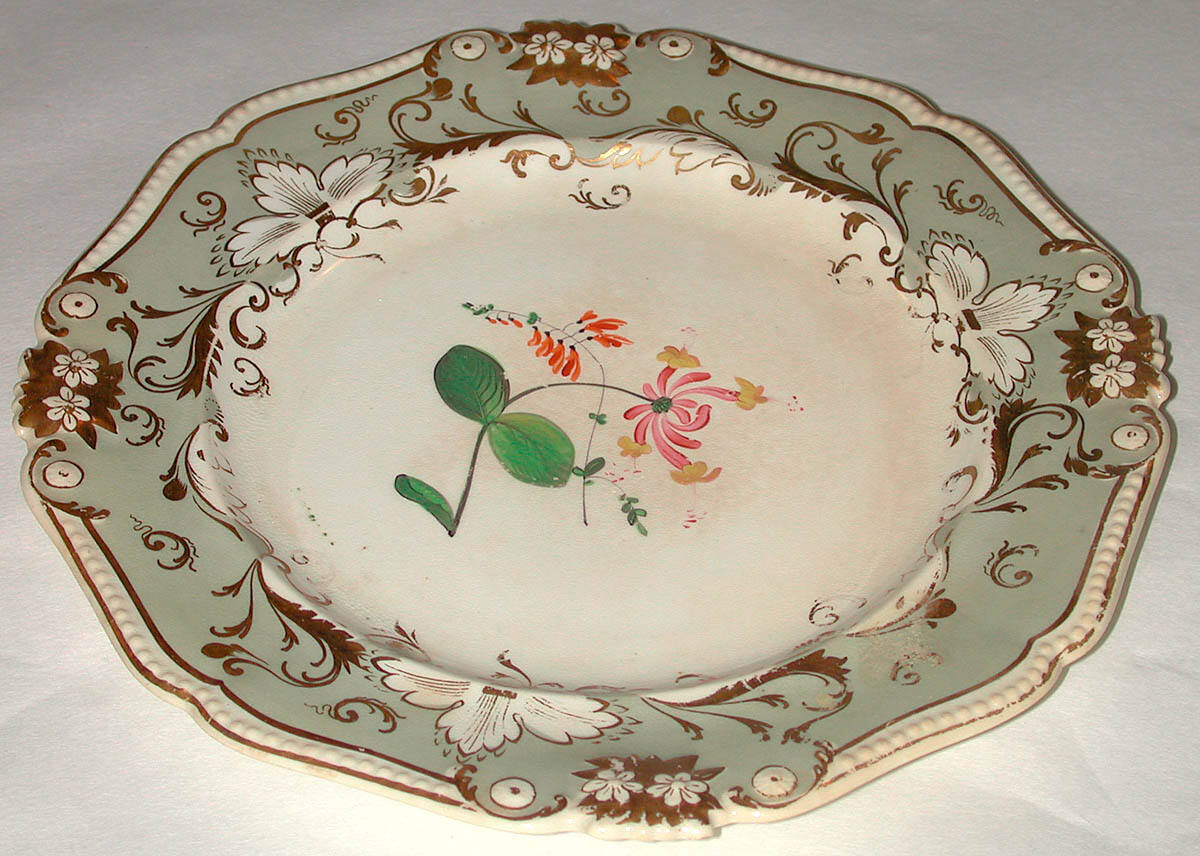 DescriptionA cream colored plate with gray border decorated with gilt flower and leaf design. In the center is a spray of flowers enameled in several colors.ProvenanceWith Boswell & Ward, London, by September 9, 1932 [1];