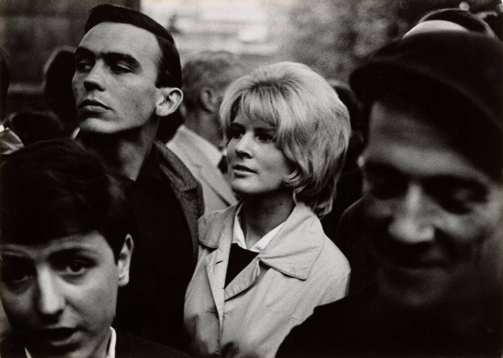 DescriptionImage of a man and woman standing next to one another looking towards something happening in the distance. Two blurry figures appear in the foreground; one looks up towards the camera.Gallery LabelRoger Mayne’s photograph of a protest meeting in Trafalgar Square, London, brings us strikingly close to four spectators. The impact of this picture comes from its size, as Mayne printed relatively large photographs for the period. Though the subject of this protest is unknown, the political moment in England was charged. Between 1960 and 1961 Mayne photographed anti-nuclear bomb, anti-Apartheid, and anti-Vietnam demonstrations in Trafalgar Square.