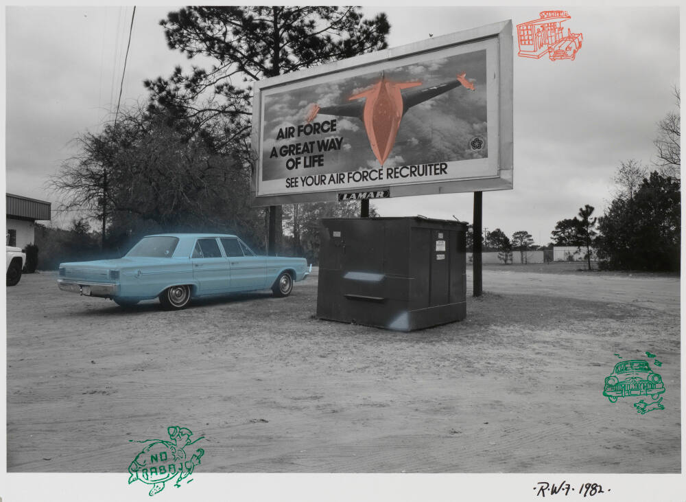 DescriptionOne of twenty photographs included in American Roads portfolio. Image of a blue car parked next to a dumpster below a billboard advertising for the Air Force.ProvenanceCopyright© Robert W. Fichter