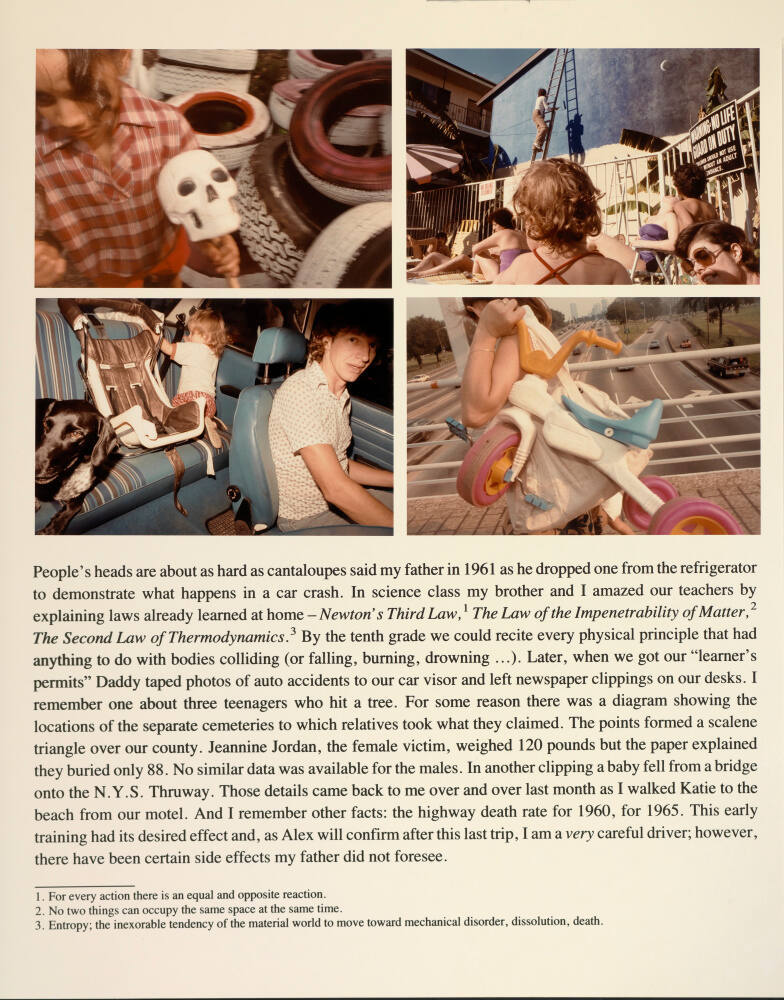 DescriptionOne of twenty photographs included in American Roads portfolio. Four images on one sheet with text below; Images of child holding skull on stick next to tires, people in swimsuits behind fence watching man climb ladder, man seated in car with child in backseat next to carseat, and cropped image of woman carrying tricycle over her shoulder as she crosses bridge.Gallery Label“Art is about creating meaning, and I think meaning lies in the relationships between things. For me, single images, like glimpses of life from an elevated train, are poignant, but have little to do with understanding. A long time ago I began to construct meanings by combining images. First I combined photographs. Then I began to put pictures with all sorts of other things … One’s experience always exceeds one’s vocabulary, so art making for me is a way to name the unnamable or make visible something that wasn’t visible before.”
