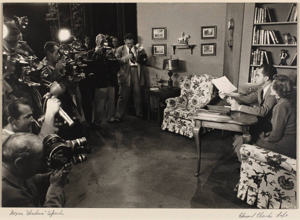 On sheet verso, bottom, blue stamp: "LIFE MAGAZINE / LIFE PHOTO BY / JOE SCHERSCHEL / Property of Life Magazine / Reproduction Forbidden without Express Consent / TAKE No. / 3rd / DATE: / 10-21-60 / SET NO. / 61074 / STORY & LOCATION / NIXON / REPORTER / DEPT. / NO. OF PRINTS / BLACK & WHITE FILM / COLOR FILM / 35 mm 17 / 120 / PACK / CUT / 35 mm / 120 / CUT";