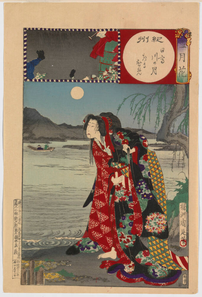 DescriptionThis is a print from the series Snow, Moon, and Flowers, in which Yōshū Chikanobu derived narratives from famous figures, plays, and legends. This print depicts a scene from the Kabuki play Musume Dōjōji. According to the play, the maiden Kiyohime had fallen in love with a celibate monk of the Buddhist temple Dōjōji. Burning passion turned her into a serpent as she desired to cross the flooded Hidaka River in order to see the monk at the dedication ceremony of a temple bell. She then turned herself back into a young maiden as it is depicted here. Her desperate desire to see the monk is communicated through her pose – she is leaning forward as she grabs her jumbled hair with her left hand. Although she is in the form of young maiden, the triangle patterns on her costume referring to the markings on a serpant imply her true self. The inset on the top left gives a glimpse of the climax of the play: Kiyohime wraps herself around the temple bell, turns it burning hot, and kills the beloved monk who had hidden himself under the bell.
