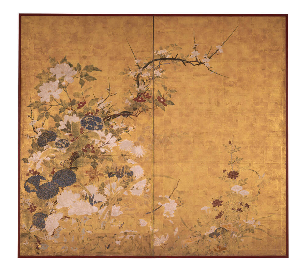 DescriptionA single, two-panel screen painting with gold leaves, pigments and ink, depicting varieties of flowers throughout four seasons: a dense group of blossoming flowers is painted on the lower part of the left panel; a plum branch extends to the right panel; and a small group of flowers is placed on the lower part of the right panel. The screen is framed with a modern reddish-orange lacquer frame.Exhibition HistoryNone known.