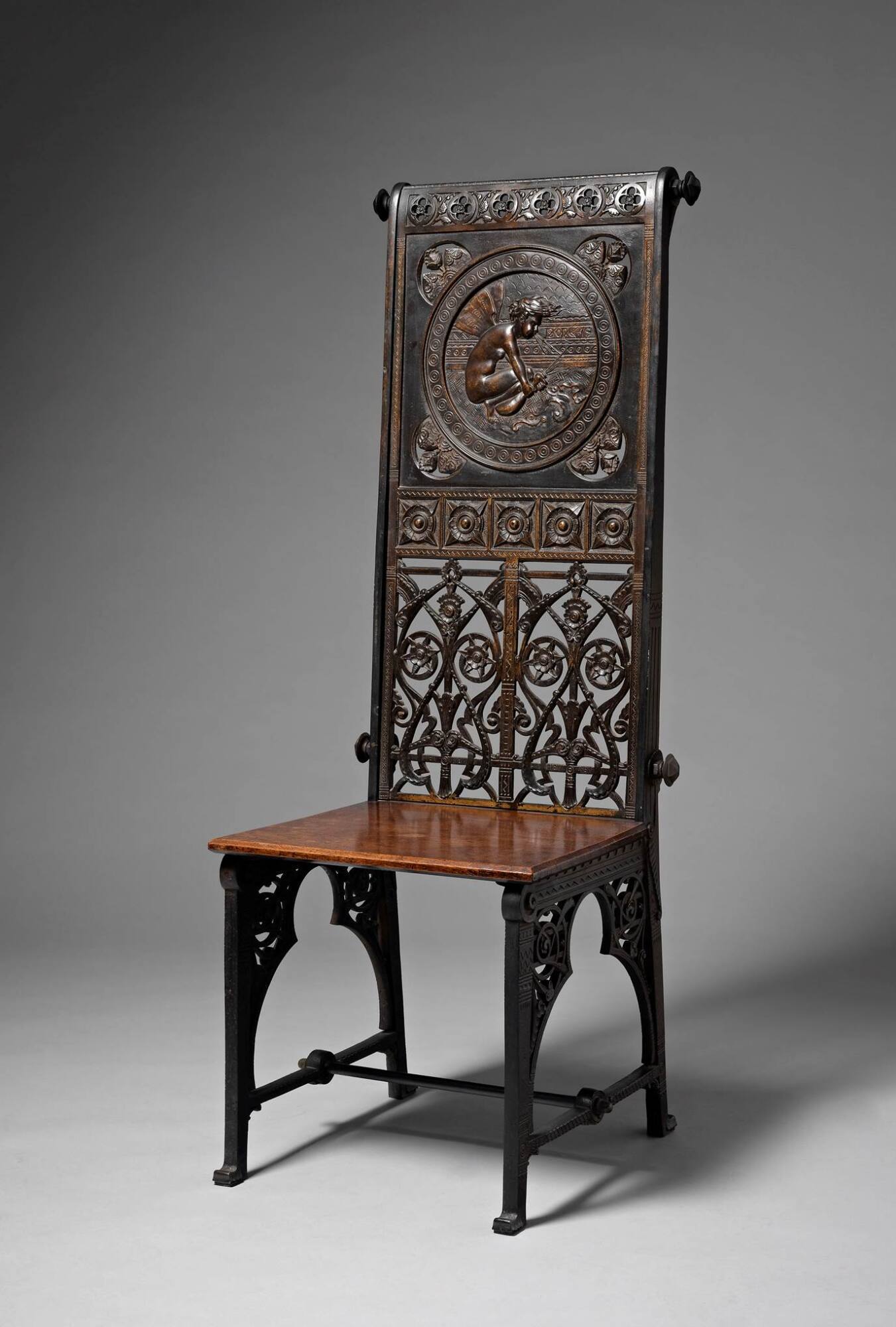 DescriptionHigh-backed chair constructed of cast iron, with a wooden seat. The legs are cast scrolled geometric plant and flower forms, decorated with incised lines and zig-zags. The metal back is cast in one large piece and is marked Coalbrookdale with a registry mark for March 8, 1870 as well as a production number, No. 239430. The roundel in the center back of the chair depicts Boreas, the Greek god of the North Wind, as a nude winged figure, blowing wind over land and water. The chair back mimics a scroll, with the dowel handles at the top and at the base of the wooden seat. Below the roundel the chair back is filled with patterns and decoration including sinuous plant forms.Exhibition History