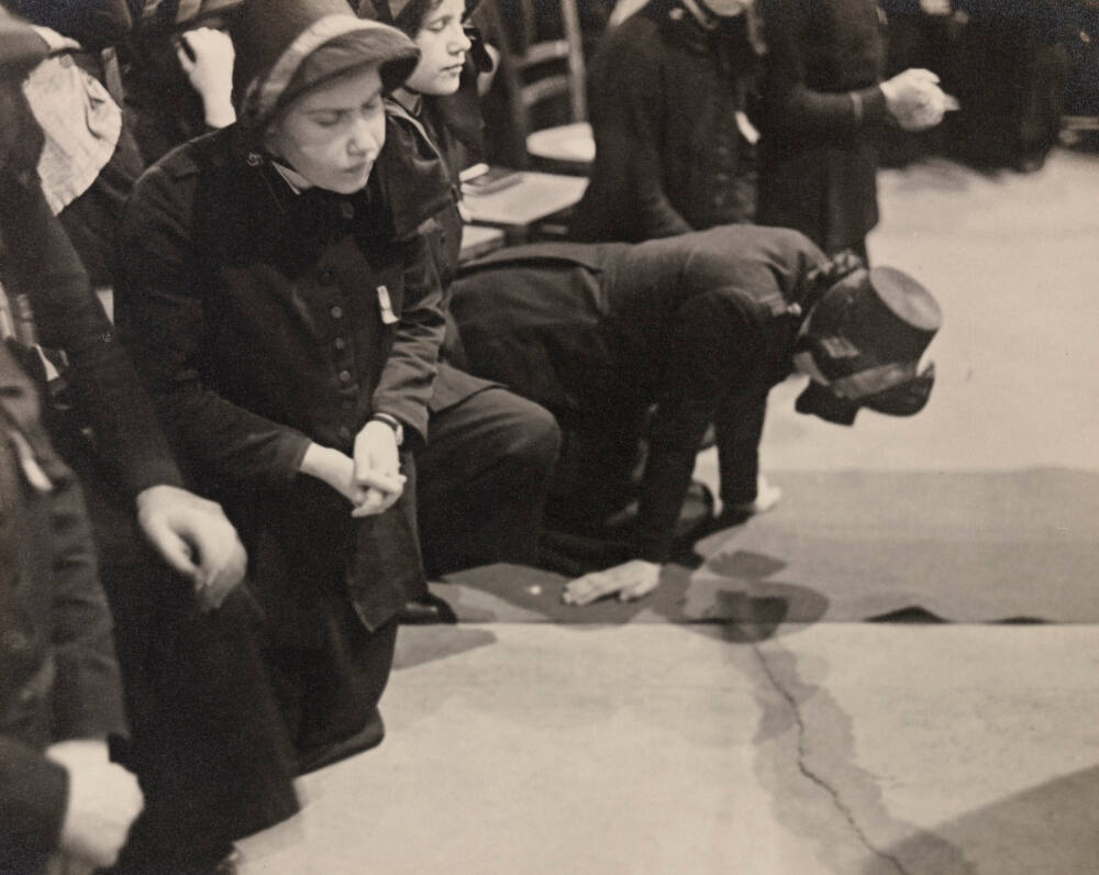 Inscribed on mount verso, top, in blue pen: "Prayer at the Berlin chapter of the Salvation Army 1928"