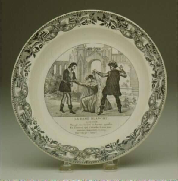 DescriptionTransfer printed in black with scenes from plays (possibly opera): "La Dame Blanche", "Les Inconveniences de la Diligence", Le Hussard de Felsheim", "Joconde" with animal and foliage decoration on the brim.