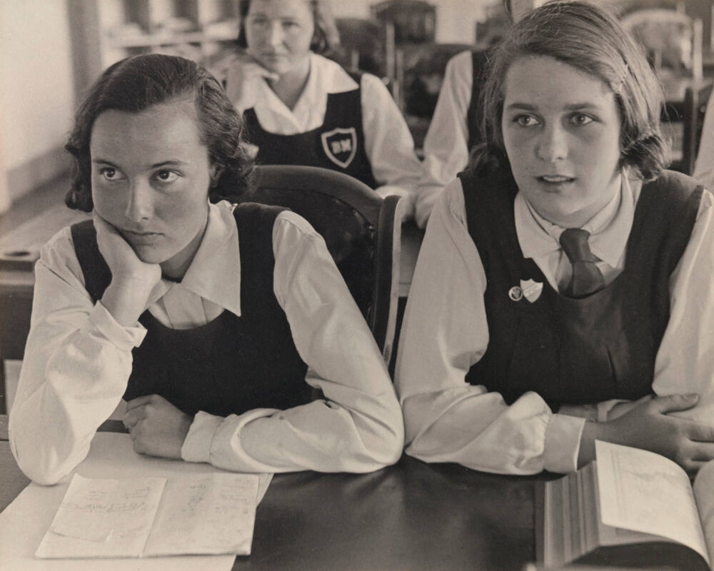 Inscribed on mount verso, top, in blue pen: "Two English students attending lecture at Pension at Heubit in Lausanne, Switzerland, 1932".