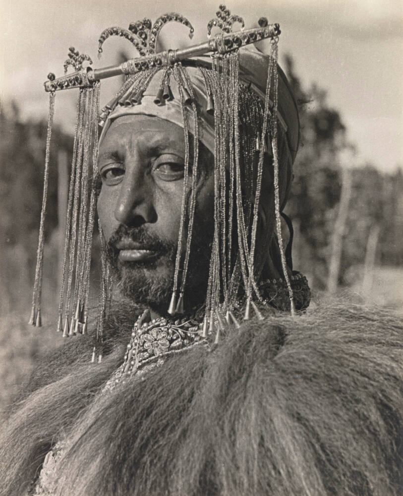 Emperor Haile Selassie's Master of the Hunt with gold headdress and lion hair cape. His name is Kenjazmatsch Kabala