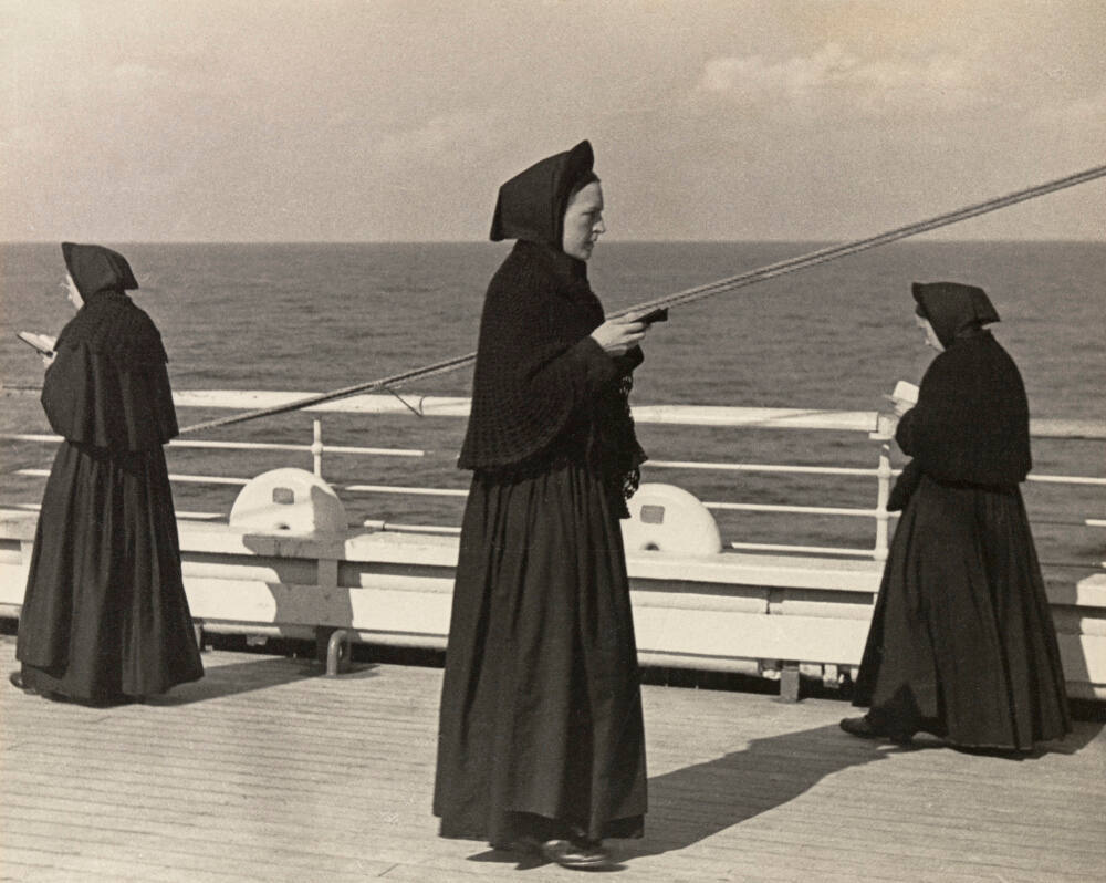 Inscribed on mount verso, top, in blue pen: "French nuns praying on deck of freighter in the Red Sea on the way from Marseille to Djibouti 1935".