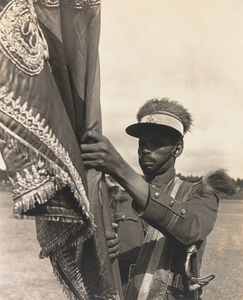 InscribedInscribed on mount verso, top, in black pen: "The Imperial flag of Emperor Haile Selassie carried by an officer / of the Imperial bodyguard at the Palace ground. 1935".