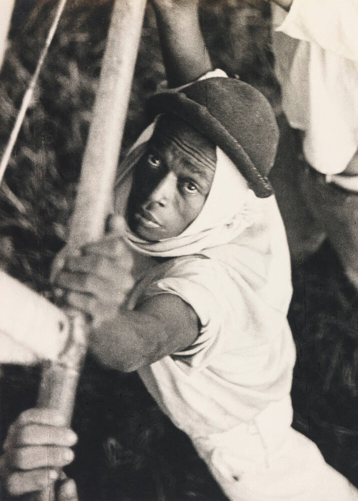 Inscribed on mount verso, top, in blue pen: "Brazilian holding the under carriage of the German dirigible "Graf Zeppelin", during stopover in Pernambuco, Brazil 1934".