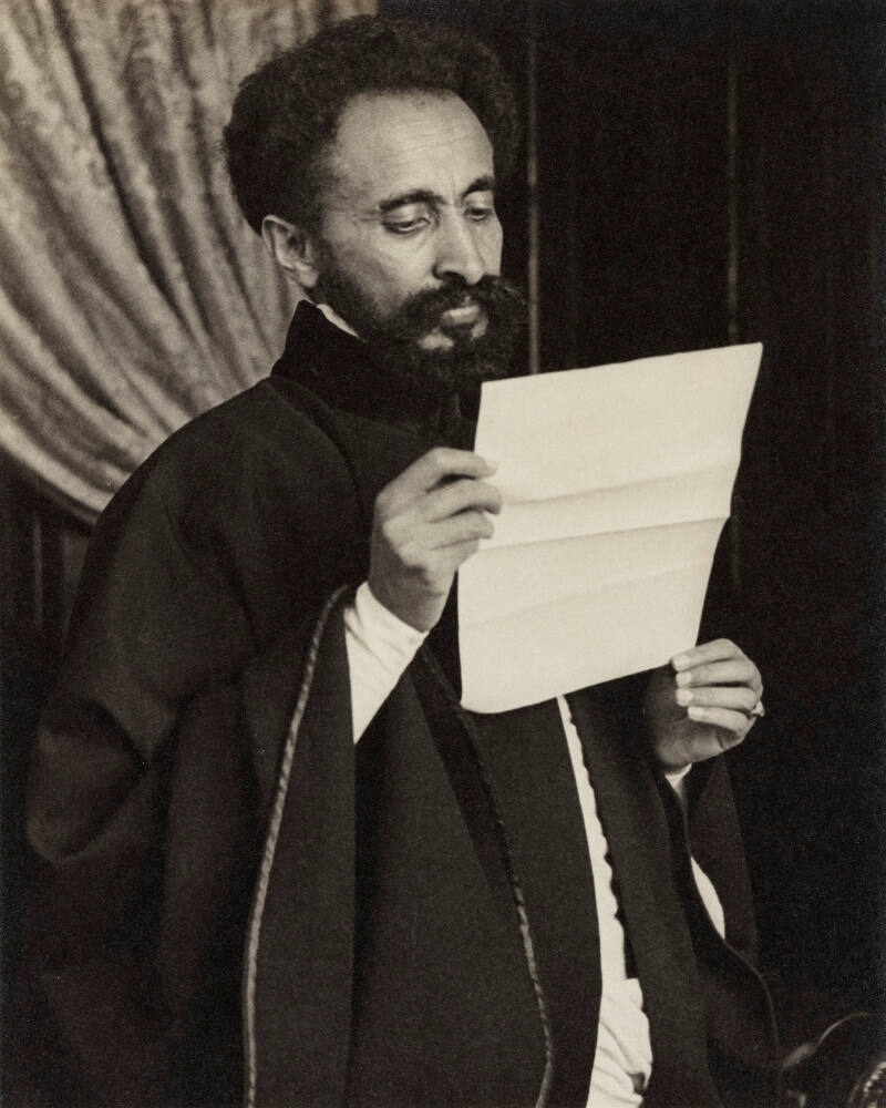 Inscribed on mount verso, top, in black pen: "Emperor Haile Selassie of Ethiopia reading a proclamation / prior to the war with Italy 1935".