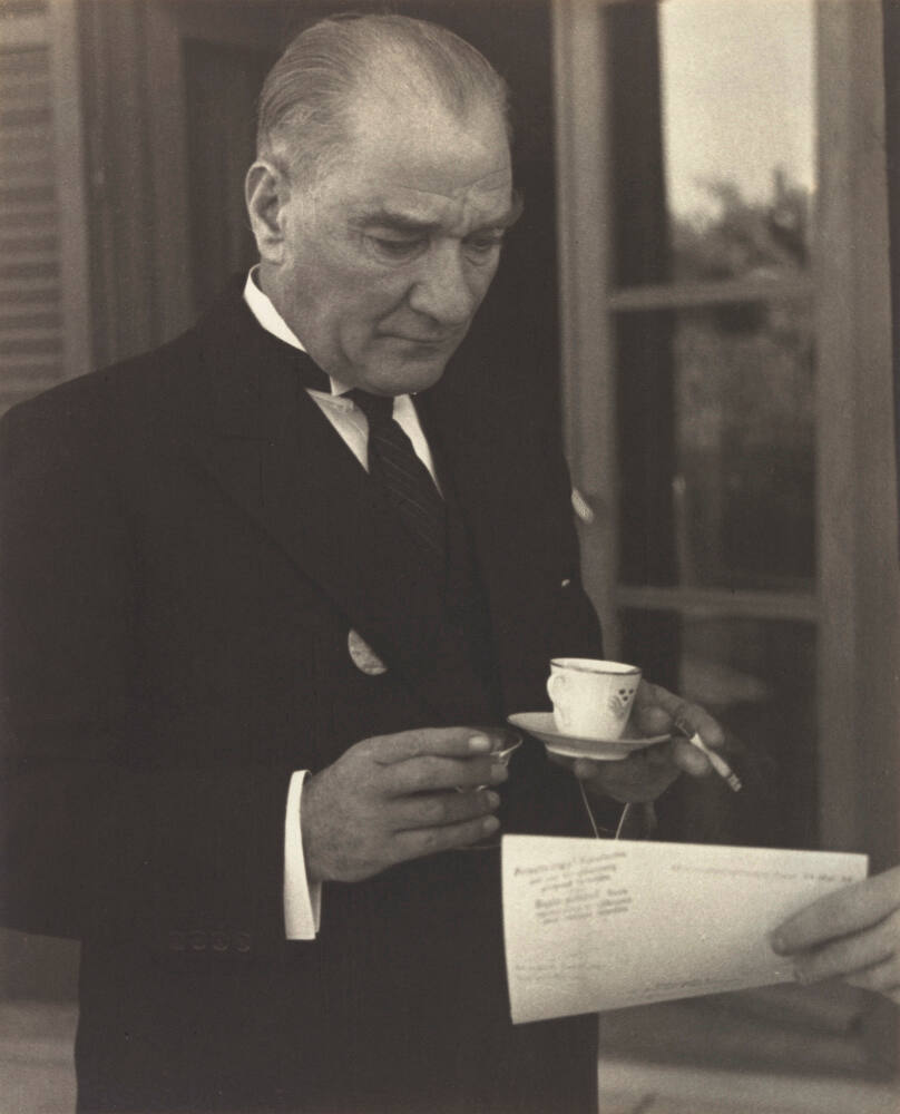 Kemal Pasha (Ataturk), dictator of Turkey does four things at the same time: holds cup of strong Turkish coffee, cigarette, also glass of brandy and looks at my pictures, Ankara, Turkey