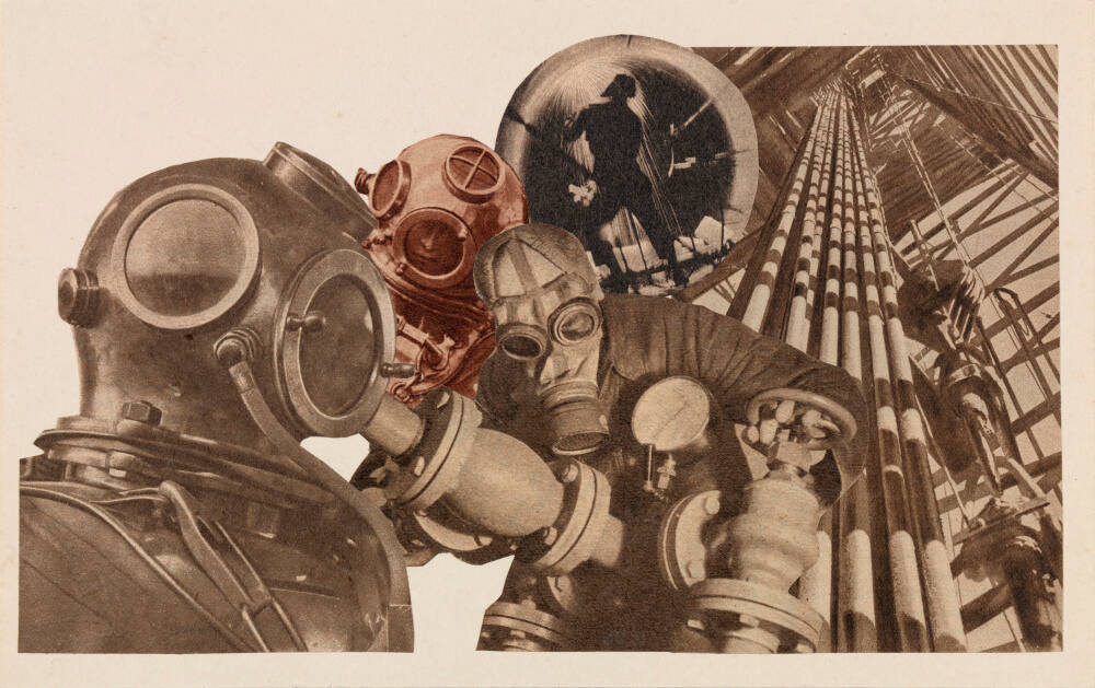 DescriptionPhoto collage with images of individuals wearing divers' outfits standing below a series of pipes and adjusting valves; a silhouted image of a person welding floats in a bubble above the other figures.ProvenanceThe Hall Family Foundation, Kansas City, MO, 2016;