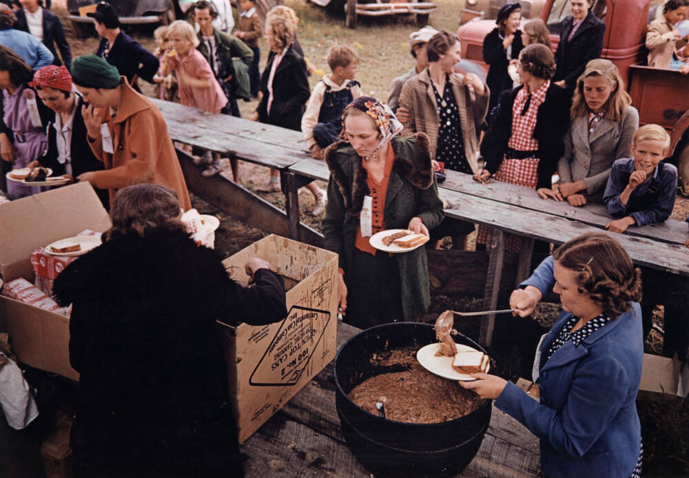 DescriptionImage of woman scooping beans onto paper plate as people stand in line and visit with one another.ProvenanceThe Hall Family Foundation, Kansas City, MO, 2016;