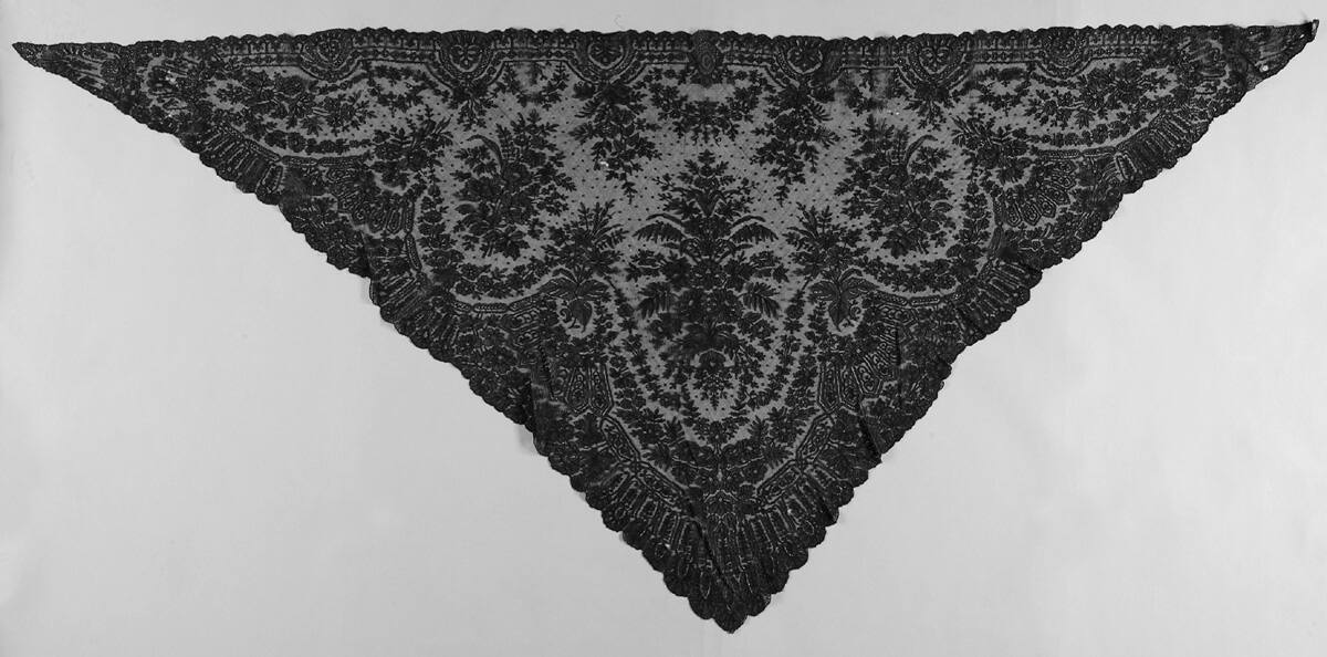 DescriptionBlack lace triangular shawl, all over flower pattern.
