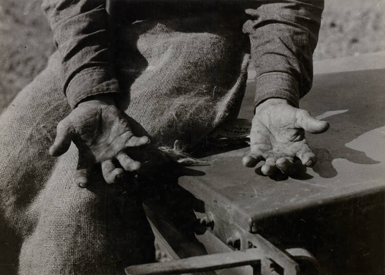DescriptionImage of man with palms outstreched to show weathered, damaged skin.Exhibition HistoryDignity vs. Despair: Dorothea Lange and the Depression Era Photographers, 1933-1941. The Nelson-Atkins Museum of Art, Kansas City, MO, June 23 – November 26, 2017, no cat.