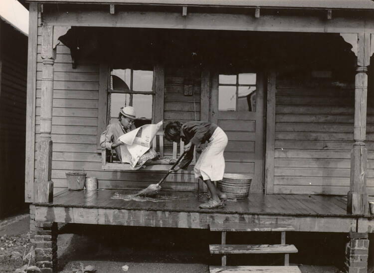 DescriptionImage of one woman seated on porch swing reading newspaper while another cleans soapy water off the floor below her with a broom.Exhibition HistoryDignity vs. Despair: Dorothea Lange and the Depression Era Photographers, 1933-1941. The Nelson-Atkins Museum of Art, Kansas City, MO, June 23 – November 26, 2017, no cat.