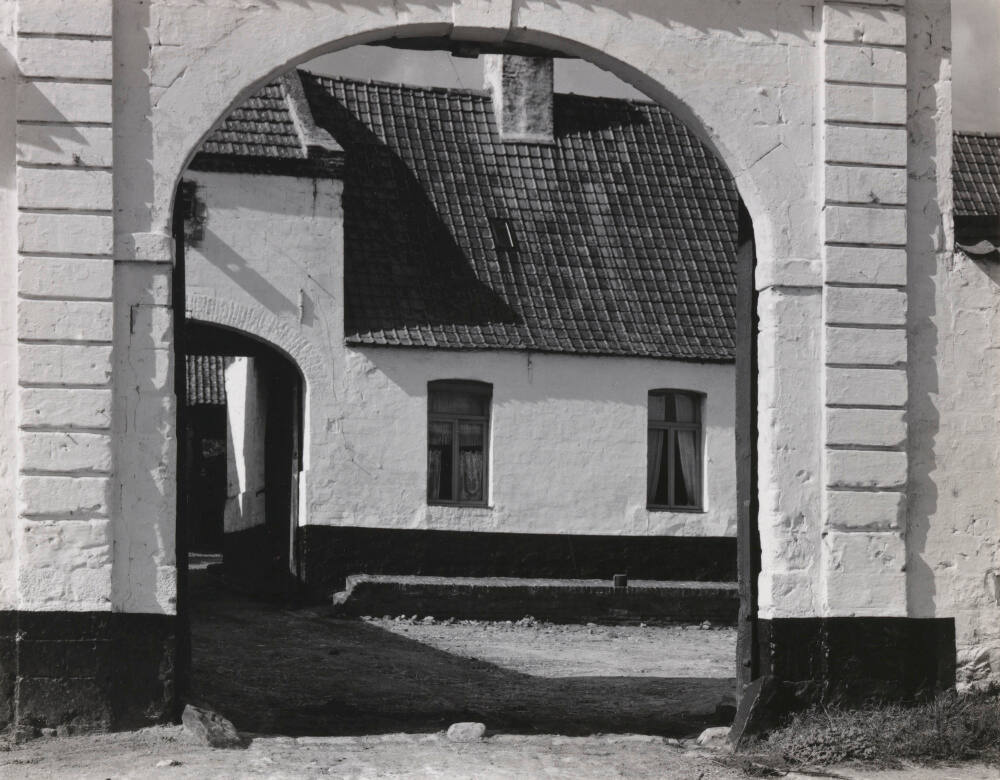 DescriptionArchitectural image looking through rounded doorway onto building façade with steep roofline and two curtained windows.ProvenanceThe Hall Family Foundation, Kansas City, MO, 2016;