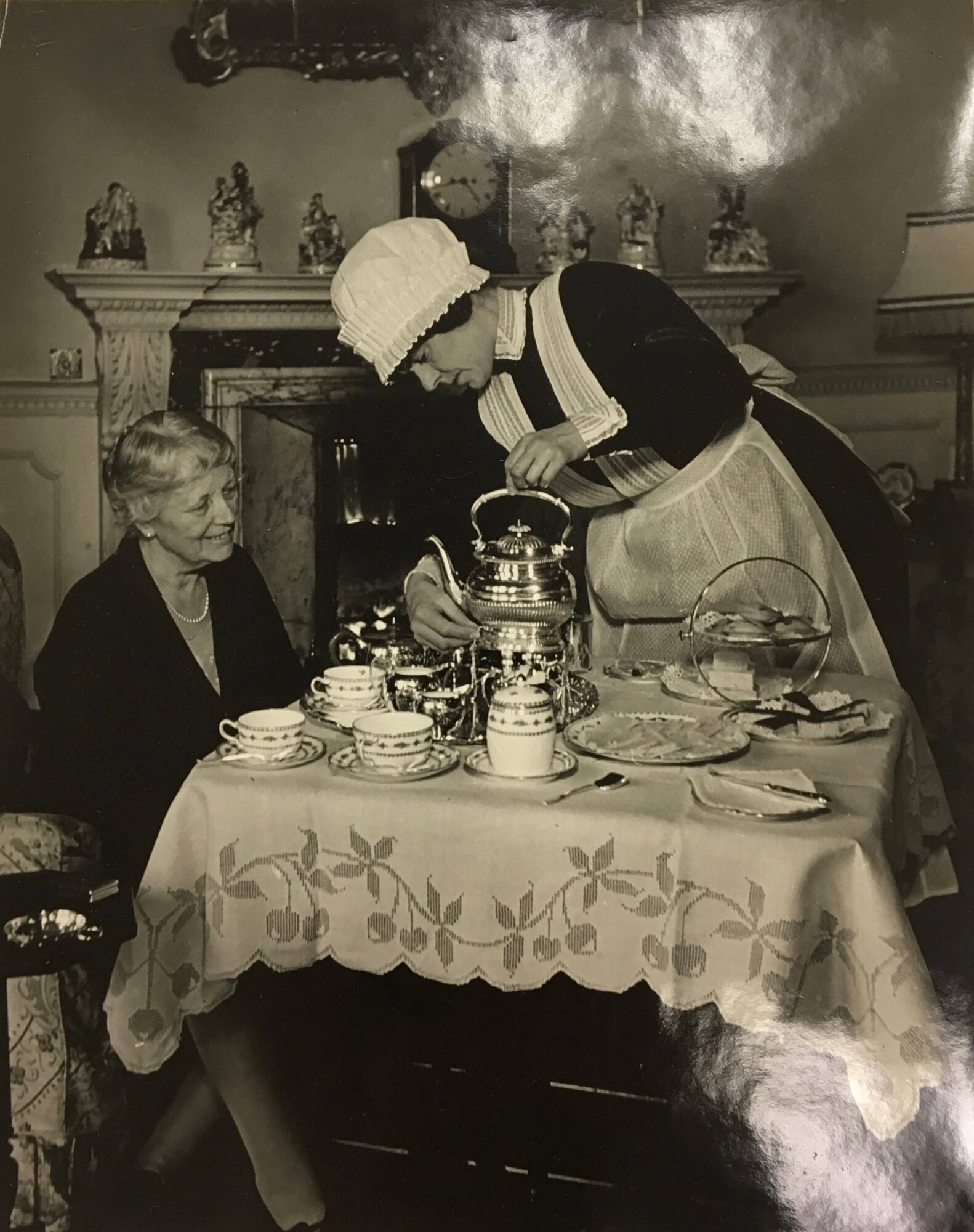 DescriptionImage of an older woman smiling while being served tea at a small table in front of a fireplace. The woman serving her is wearing a dark dress with white apron and hat. The table is formally set with silver tea service, china, and trays of sweet treats.ProvenanceThe Bill Brandt Estate;