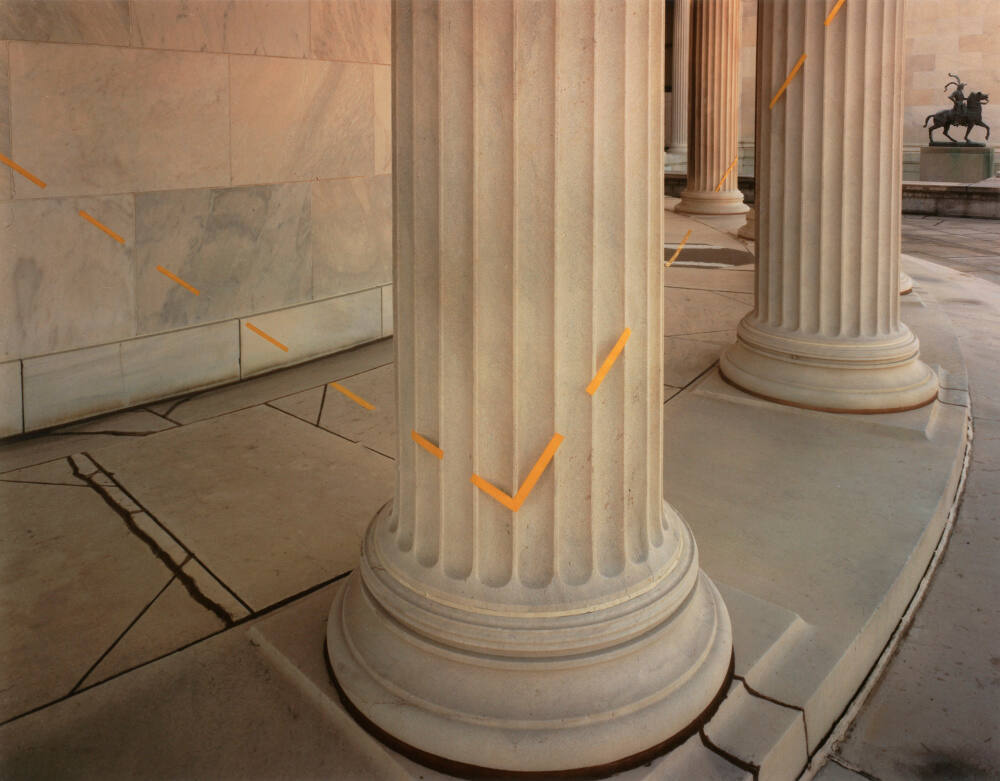 DescriptionImage of a series of round columns with a dashed yellow line in the form of a right angle over the column in the foreground.Gallery LabelIn his series Altered Landscapes, John Pfahl intervenes in nature to create unique scenes that cohere only within the two-dimensional space of the photograph. After fixing the vantage point of his camera, Pfahl alters the elements in his frame according to precise calculations.