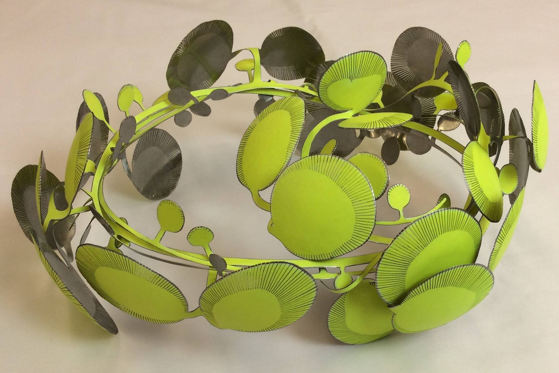 DescriptionSheet steel tiara cut into thin bands and circular shaped “leaves.” Top surfaces of the bands and leaves are painted a light green color through a powder coating method. The edges of the leaves have a series of closely spaced saw cuts perpendicular to the edge. These cuts are the width of a very thin saw blade. The edges of the leaves have been beveled and are not painted. The piece is inscribed on the back of one of the leaves “Mirjam Hiller 2015.”Gallery LabelMirjam Hiller's tiara takes the form of an abstracted vine with entwined layers of neon leaves. Hiller laboriously saws complex patterns from a single sheet of stainless steel (see design at right). She does not use traditional methods of soldering or joining in her jewelry. Rather, she bends and folds the metal to secure the work together.