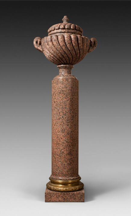 DescriptionLarge urn, spiral gadrooned with handles, in red granite, on two tall cylindrical granite columns, resting on round gilt bronze base ornamented with laurel leaves, and on square ground base of granite.Provenance