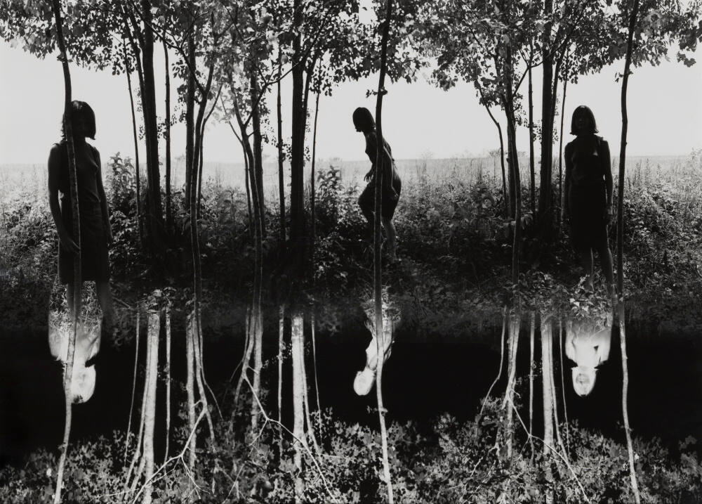 Signed, titled, and dated on sheet verso, lower right, in black pen: “”SMALL WOODS WHERE I MET MYSELF” (EARLY VERSION) 1967 / JERRY N. UELSMANN* / (VINTAGE)”;