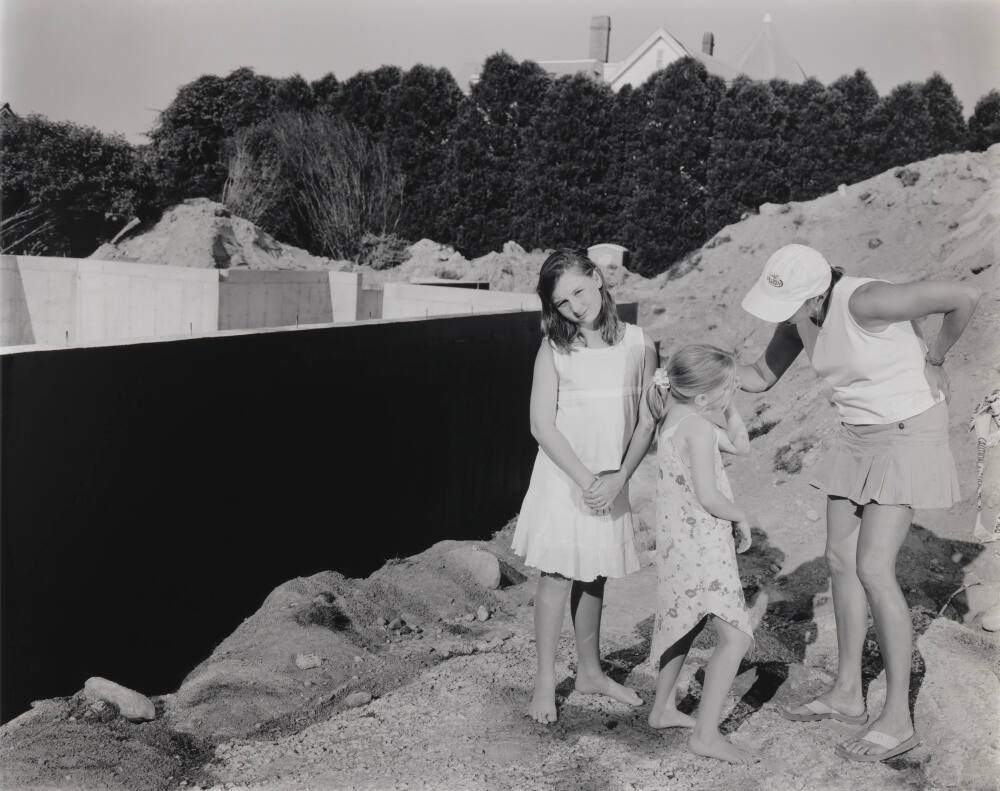 Though best known for her large-format color photographs of her upper-class family and friends, Tina Barney has also explored similar subjects in black-and-white film. The lack of color removes the potential for what Barney calls "sentimental" distractions. Instead, the graphic contrasts of light and shadow create different formal relationships. As the title of this piece suggests, Barney’s primary interest is the black wall of a building foundation at the left of the composition, not the three figures at right.