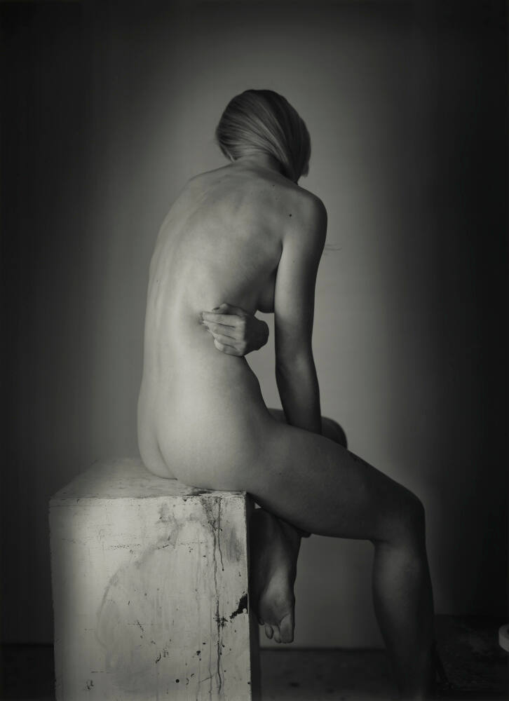 DescriptionHighly detailed image of a nude woman seated on plinth marred with splattered paint. Her back is towards the viewer as she wraps her left hand around her waist; her hair is smoothly brushed around her neck and gathered over her right shoulder. She has two small star-like tattoos on her right thigh and we can see the bottom of her left foot is soiled. A soft gradation of light emanates around the figure and fades to black along the perimeter.ProvenanceThe Hall Family Foundation, Kansas City, MO, 2016;