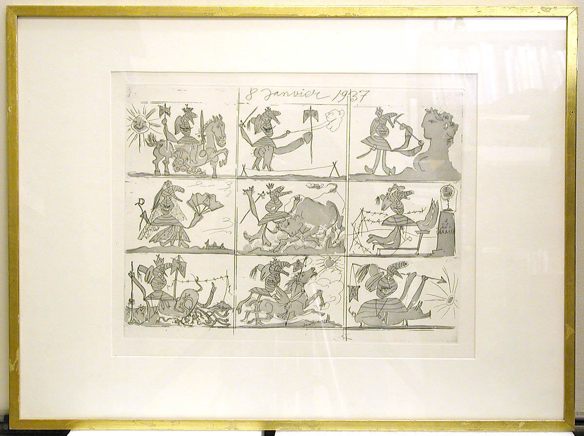 Gallery LabelThis work by Pablo Picasso is a scathing condemnation of the Fascist General Francisco Franco, who led the fight against Republican forces during the Spanish Civil War (1936–1939). Franco appears as a grotesque monster, hacking away at art and classical ideals, riding on a pig, and parading as a woman. Picasso’s lively linework was probably transferred from a drawing and then etched into the surface of a printing plate. The fields of gray—produced by a technique called aquatint—give the work a forceful, graphic quality. Originally, each image on this sheet was to be cut and sold separately to raise money for the Spanish Republican cause.