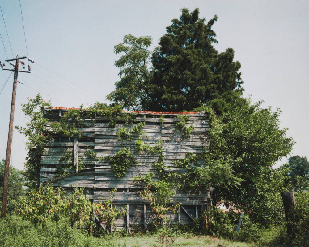 This image features a small, run-down building that was once a general store belonging to the photographer's great-uncle before becoming the home of a palm reader. It was taken as part of a set of photographs showing different vantage points over the course of eight years. When viewed collectively, these images highlight the effects of time as nature slowly overtakes the deteriorating structure.