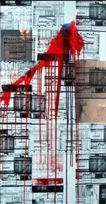 DescriptionThe piece is a large and flat rectangular plaque with images and text on white porcelain. There are black and white images from the Financial Times printed onto the white porcelain sheet, covering most of the surface. A large red splotch of paint is central to the composition with long drips, some spreading to the base of the work. There is a small section of blue paint in the upper right section of the red paint which turns to near black and drips alongside the red paint. A fired metallic enamel has been applied to the surface in a few areas, especially in the upper right.Exhibition History