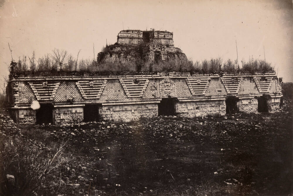 SignedOn label attached to mount recto, lower left, in black type: “Charnay, photogr. [area blacked out with marker] Gide, éditeur, Paris. / PALAIS DES NONNES, A UXMAL / FAÇADE DITE ÉGYPTIENNE”