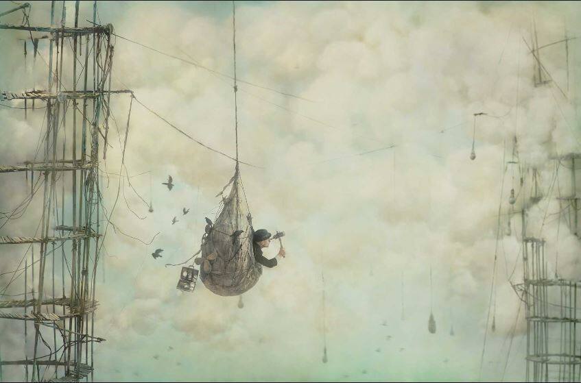 DescriptionSurreal image of a black-suited fellow who peers through a primitive handheld telescope as he leans out of a cocoon-like orb that hangs amidst the clouds. Other smaller orbs appear in the distance, partially hidden by clouds, and two tall frail structures frame the image.ProvenanceThe Hall Family Foundation, Kansas City, MO, 2016;