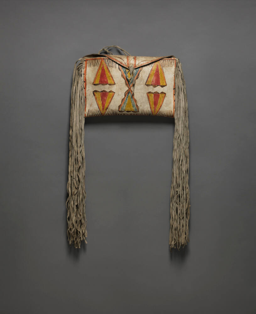 DescriptionFlat, rectangular shaped rawhide container with flap closure painted on the front surface with geometric designs with long leather fringes attached to both sides of the bag.Exhibition HistoryThe American Indian Parfleche: A Tradition of Abstract Painting, Des Moines Art Center, Des Moines, Iowa, May 28-August 7, 1994, no. 123.