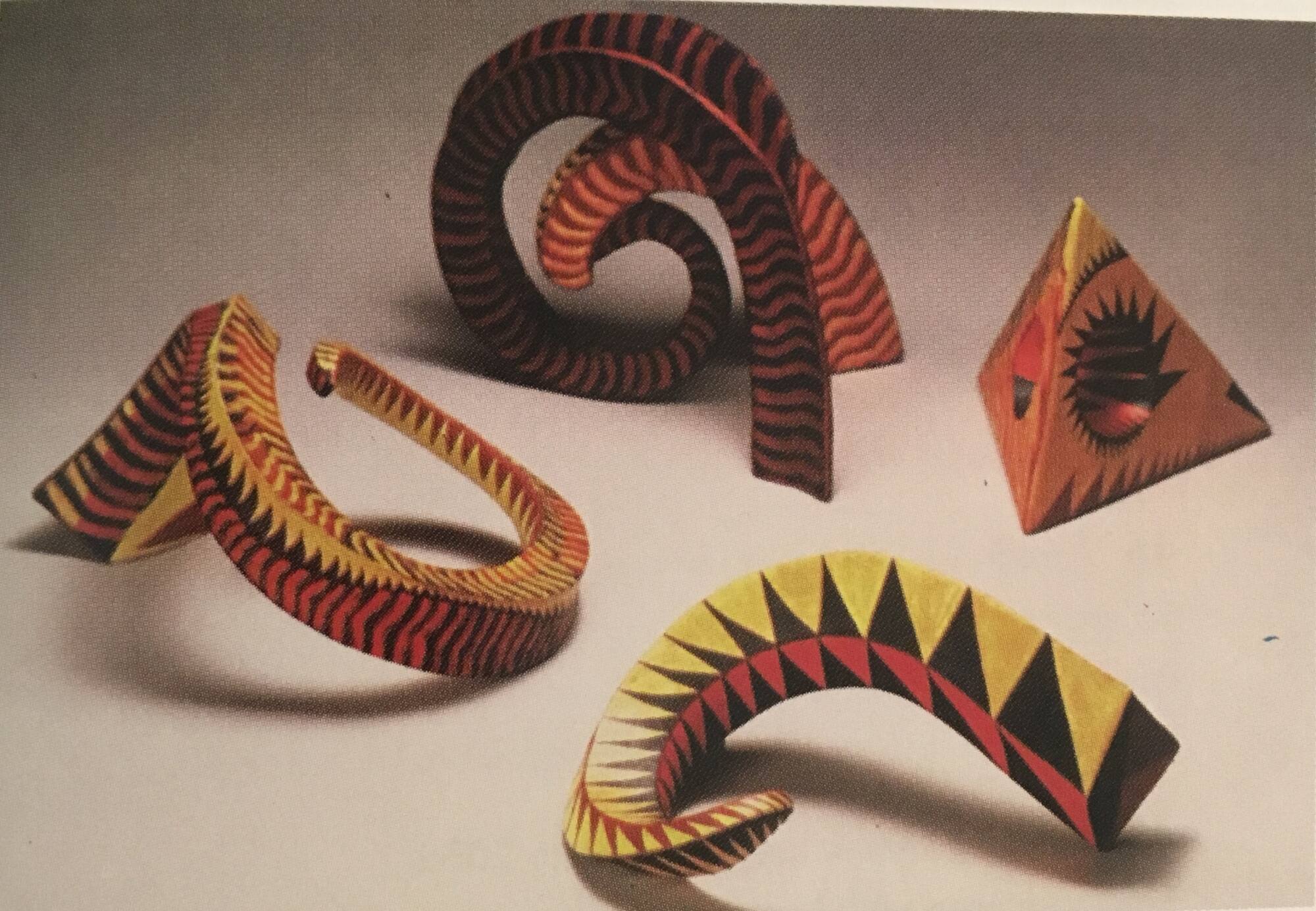 DescriptionFor Perth includes four objects made of papier-mâché, painted red, yellow, orange, and black. The armlet is in the shape of a pyramid with a circular opening in the center of two of the surfaces, painted primarily in orange with black star-burst designs around the opening for the arm and yellow and orange star-burst patterns on the edges. The large and small “collars”, which can be worn on the neck, and are shaped like rams’ horns, have surfaces painted with yellow and black, and orange and black triangular patterns. The table-top piece is also reminiscent of two rams’ horns with the surfaces painted with orange and red and orange and red chevron patterns. Provenance