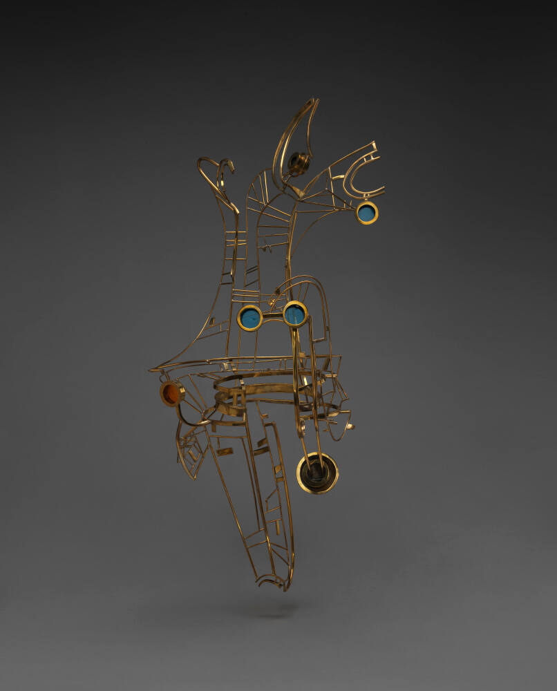 DescriptionMade of brass, bronze, and blue and orange Plexiglas, this large linear sculpture forms an abstracted horse’s head. The design of squares, rectangles, curves, and triangles, extends above and below a semi-circular collar. When worn, the sculpture, or necklace, would extend above and below the wearer’s neck. There are four circles of colored Plexiglas, two blue circles strategically placed to be reminiscent of eye glasses. Another yellow-orange circle on the left side of the work is placed a few inches lower than the blue “glasses”. Near the top of the piece there is an additional blue circle on the top right.ProvenanceThe artist, Pittsburg, KS, 1969-2016;