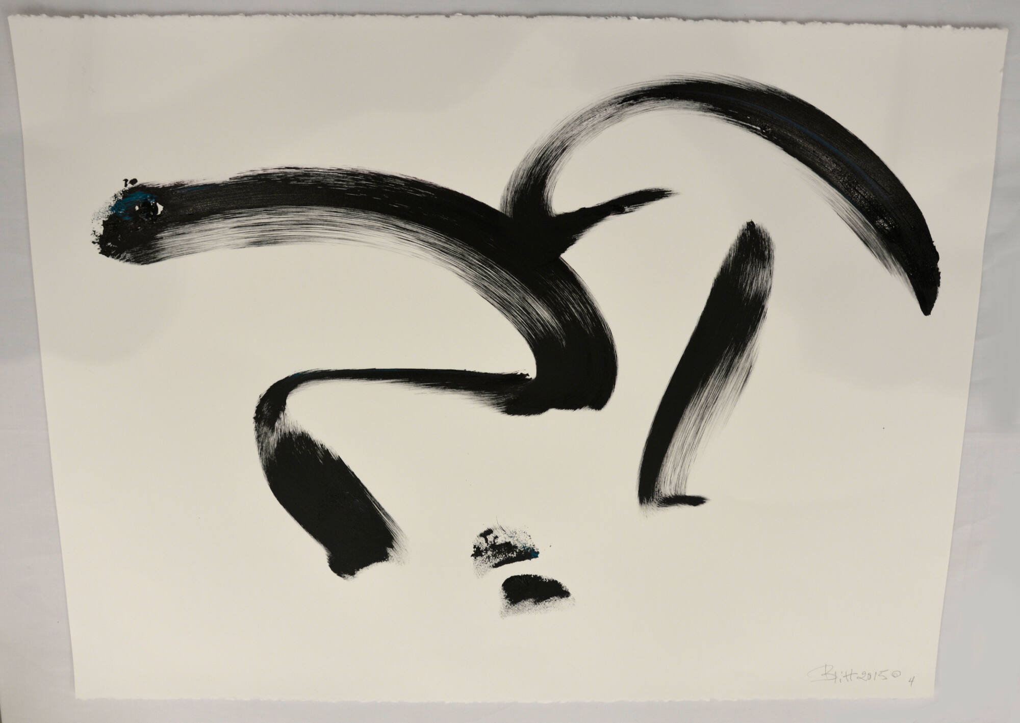 DescriptionThis is an abstract acrylic painting on paper. Black, calligraphic-like brushstrokes dominate, enlivened by a touch of brown, all set against a white background. The gestural markings curve and undulate with animated movement.ProvenanceWith Rita Blitt, Prairie Village, KS, 2015;