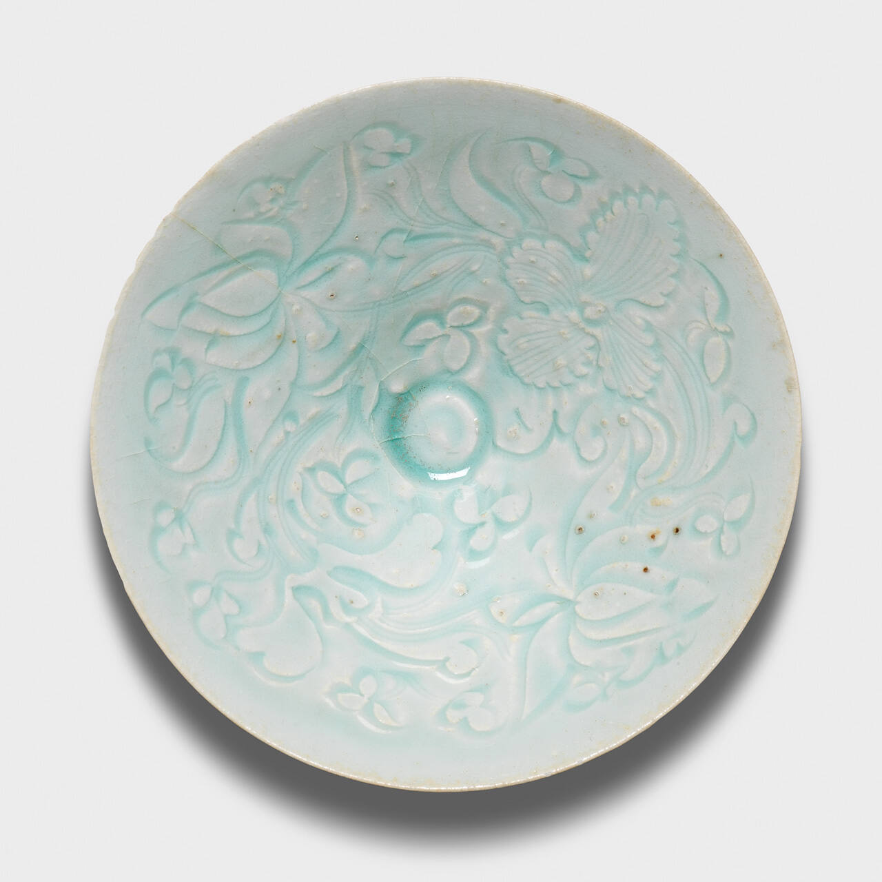 DescriptionShallow bowl with straight, conical sides. Ch'ing Pai ware, sea-green eggshell porcelain carved with a lotus and scroll motif on the inside. With a wooden stand.